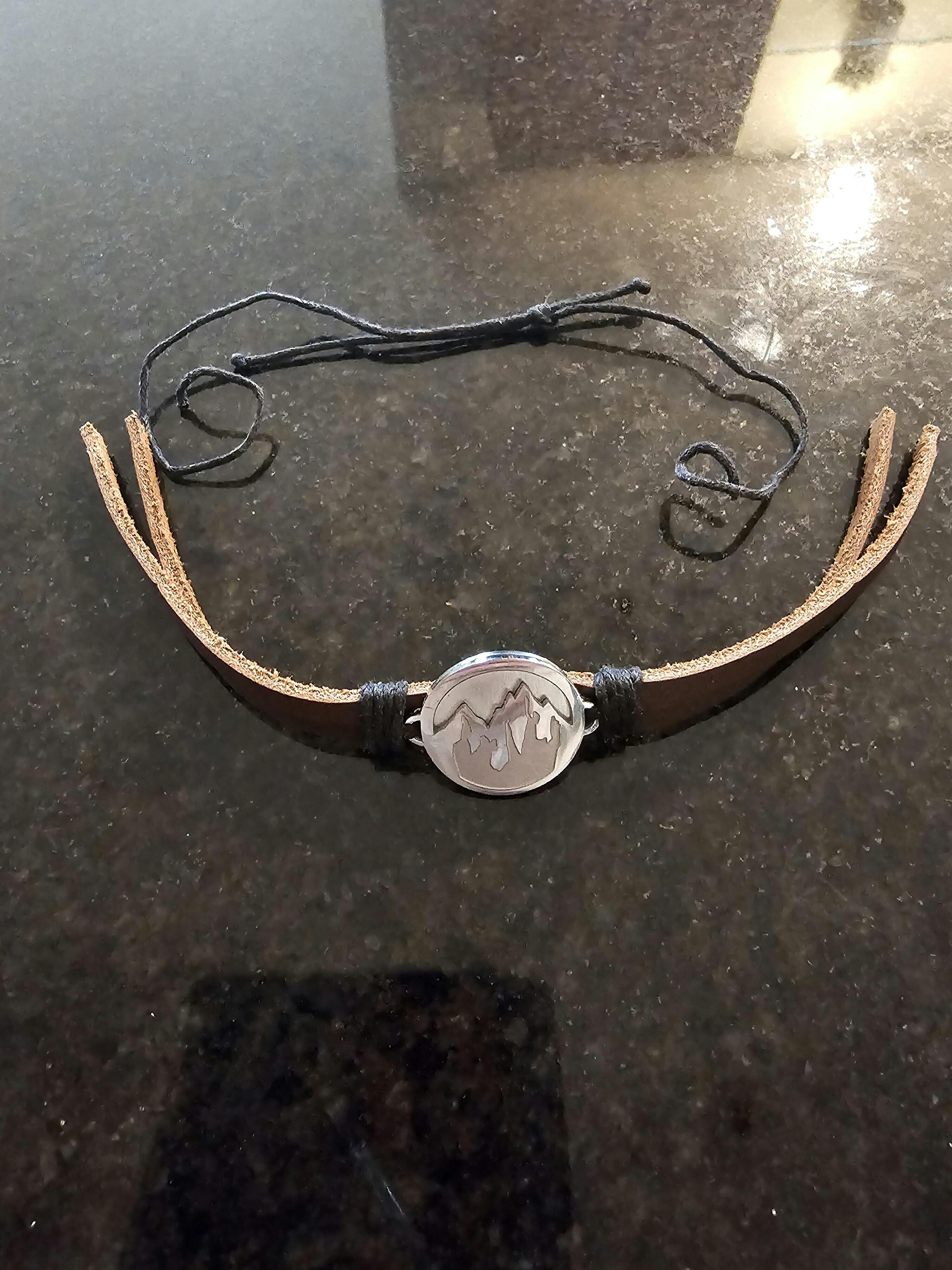 Handcrafted by human trafficking survivors, this adjustable bracelet (7"–9") features a genuine leather band and a stainless steel mountain pendant. Behind this piece is Su Su’s story.